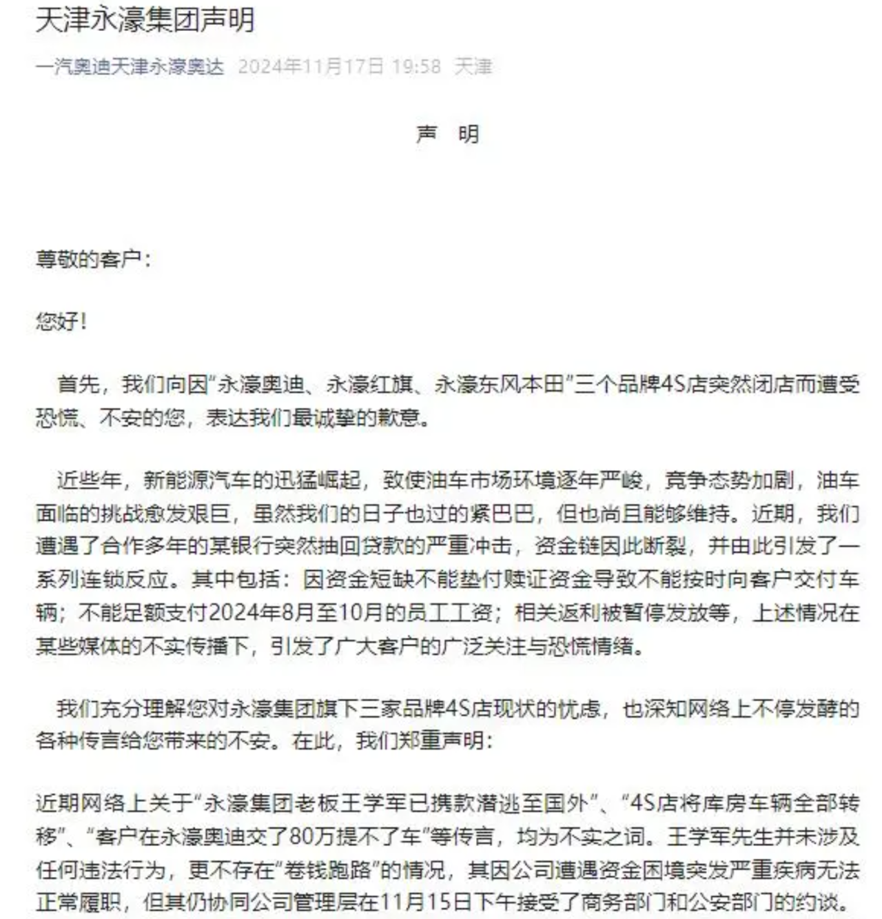 据红 · 星新闻报说念,闭店的门店为天津市西青区中北镇的永濠奥迪 4S 店,主体公司为天津市永濠奥达汽车销售劳动有限公司,是天津市永濠集团有限公司的全资子公司。该店建设面积有 18000 平方米,销售展厅 3000 平方米,是天津畛域最大的奥迪 4S 店。